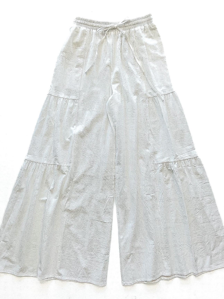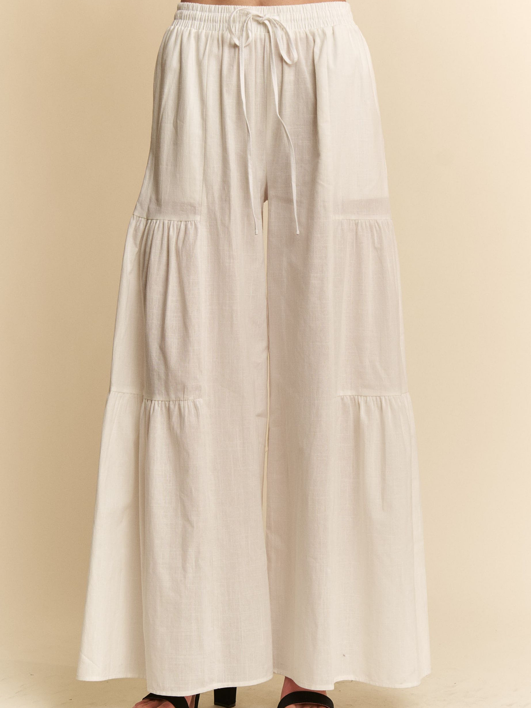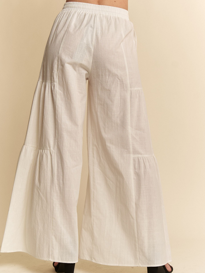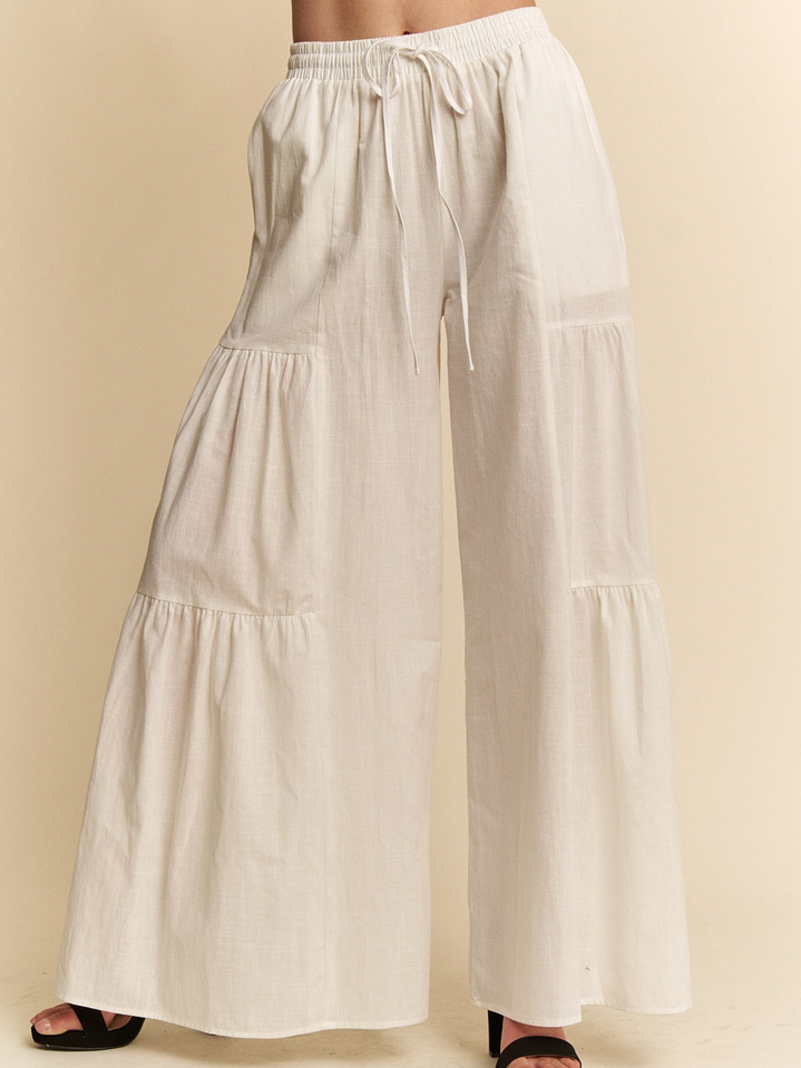 Ligero, cómodo y lleno de movimiento. Este pantalón blanco de lino con pretina elástica se adapta a tu cuerpo y a tu ritmo, mientras el corte volado le da un toque relajado pero muy chic.