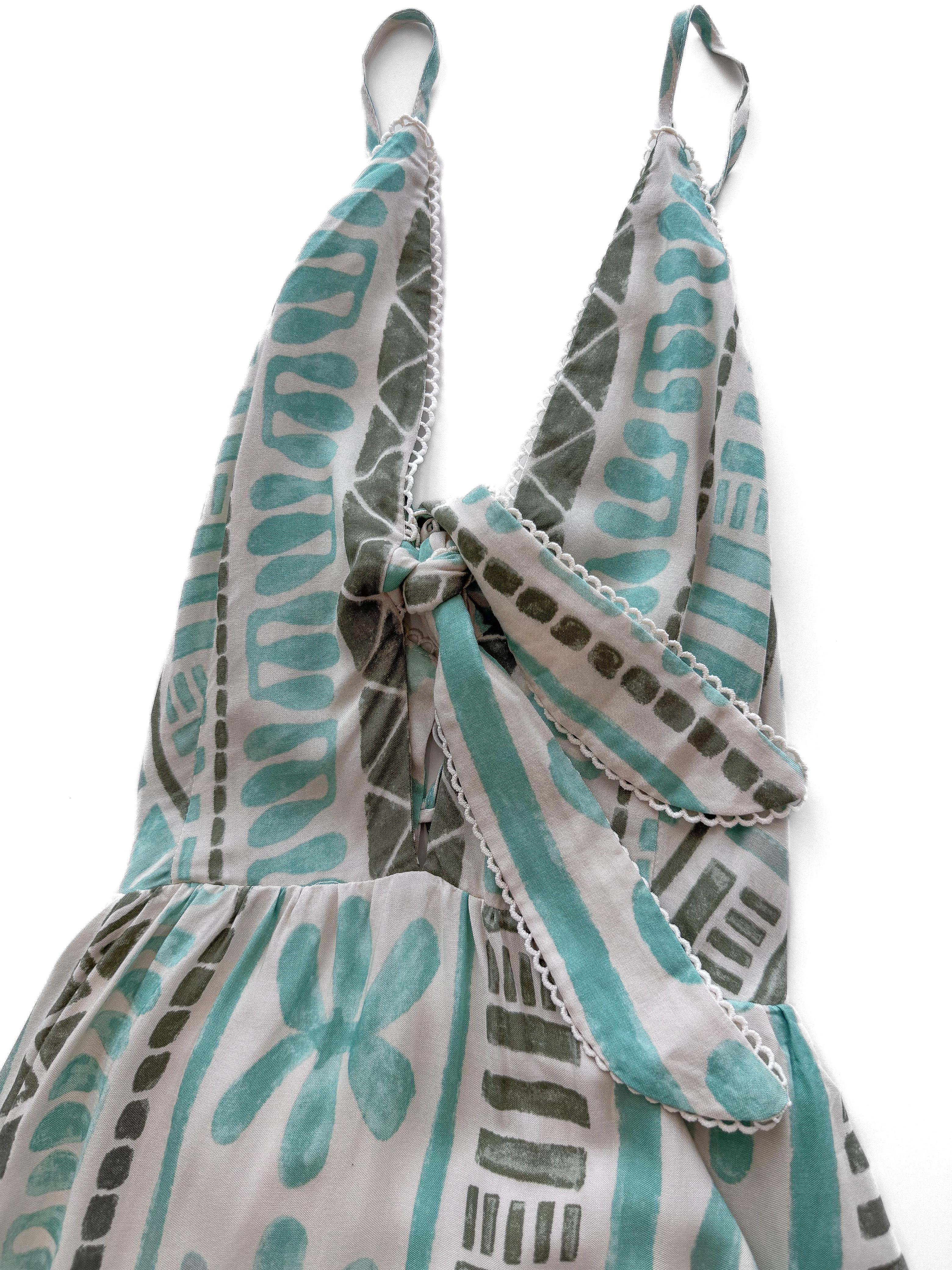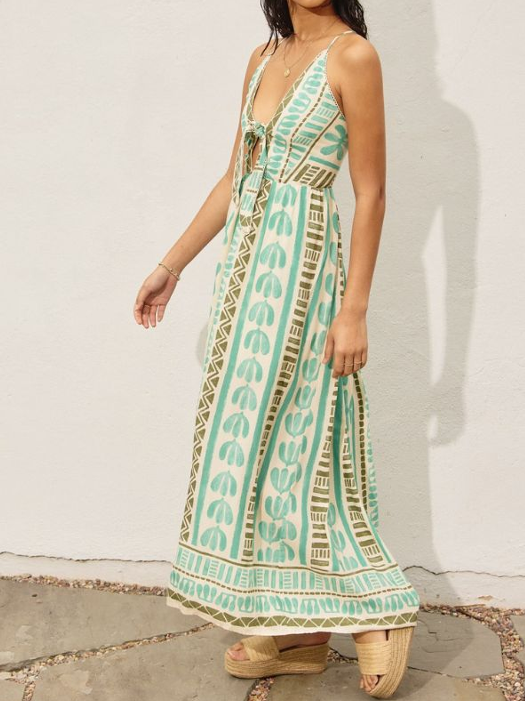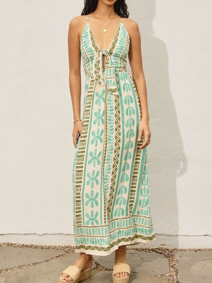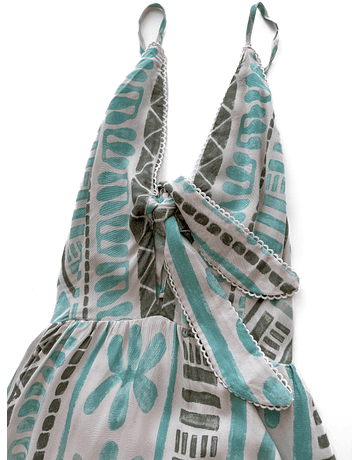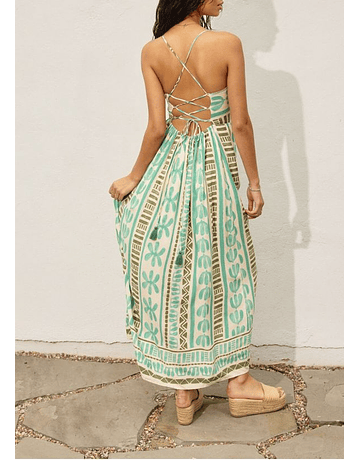 Vestido Arabella EstampadoCon un diseño etéreo y lleno de movimiento, este vestido largo destaca por su estampado en tonos verde, café y beige que evocan naturalidad y frescura. Cuenta con tirantes delgados, espalda descubierta y un delicado moño al frente que enmarca el busto con un detalle femenino.