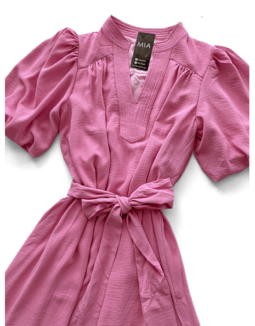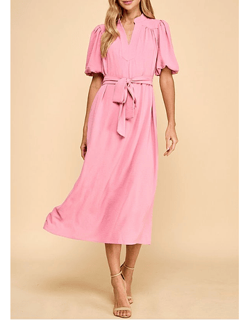 Este vestido largo en tono rosa destaca por su silueta romántica y delicada. Sus mangas ligeramente abombadas aportan volumen y elegancia, mientras que el listón en la cintura permite ajustarlo con un moño que enmarca la figura de forma sutil y femenina.